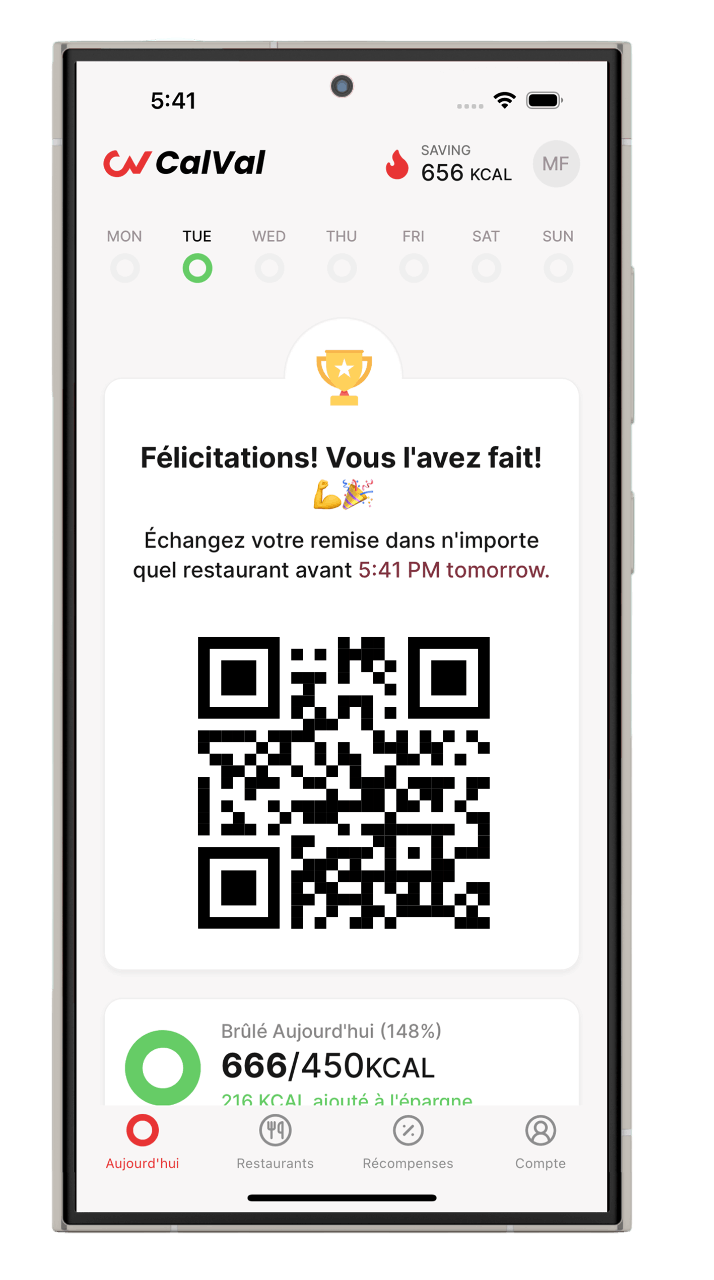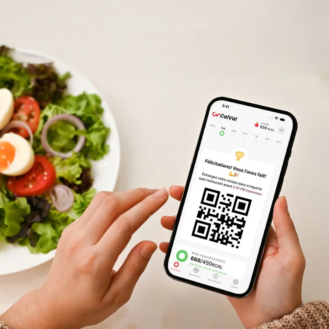 CalVal est l'application qui transforme vos efforts en récompenses concrètes. À chaque objectif atteint, CalVal vous offre des récompenses exclusives : réductions et offres spéciales dans des restaurants partenaires et des salles de sport. Restez motivé, avancez avec confiance et obtenez une récompense pour chaque effort. Téléchargez CalVal maintenant et commencez à récolter vos récompenses !